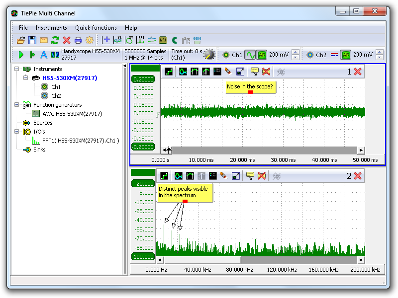 The Handyscope HS5 definitely brings an end to the idea that spectrum analyzers are expensive, hard to control and difficult to understand. The large flexibility of the spectrum analyzer makes it not just suitable for measuring high frequency signals of transmitters and receivers, but also for viewing signals that are invisible in the time domain display of an oscilloscope.