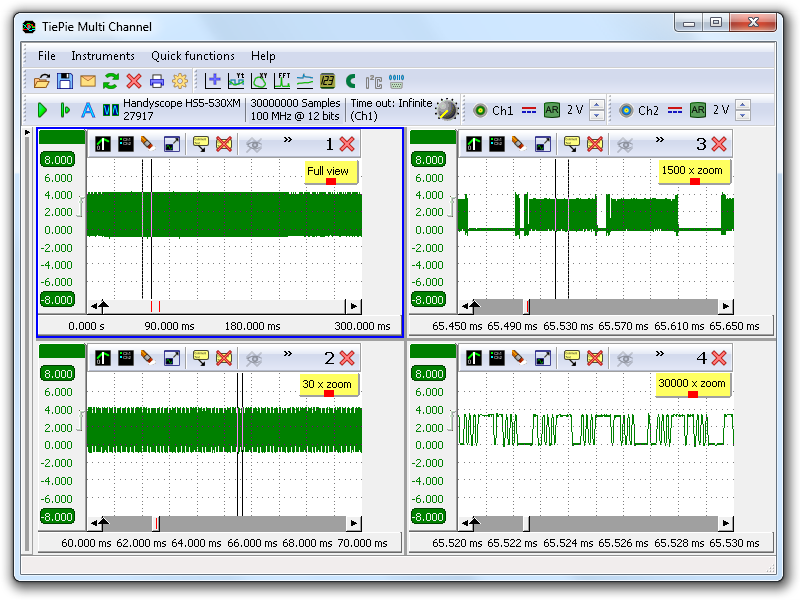 Figure 1 shows the same signal four times with different zooming factors. The lower right graph shows just 0.01 ms of the total 300 ms, a zoom factor of 30000 and still provides enough detail for accurate signal analysis.
