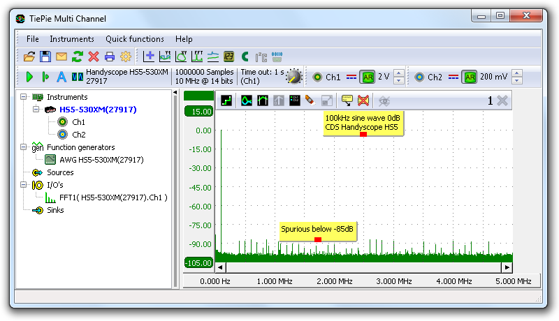 The high resolution of the Handyscope HS5 (14 and 16 bit) and its large large record length of 32 MSamples make it possible to perform a spectral analysis with up to 16 million frequency components with a very high resolution in the frequency domain. A spectrum with a dynamic range of more than 120 dB can be measured, which makes the Handyscope HS5 unique in its class.