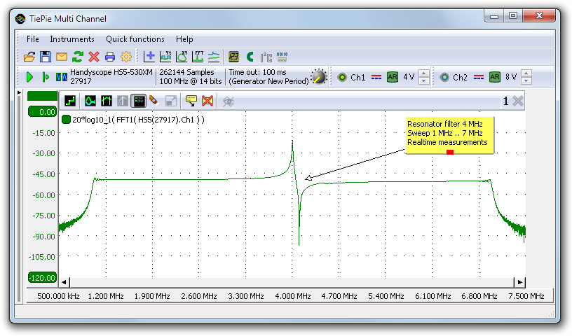 The High Resolution USB oscilloscope and the arbitrary waveform generator in the Handyscope HS5 can be easily synchronized by setting the trigger source of the oscilloscope to one or more generator trigger events: start, stop and new period. This synchronization makes it possible for example to perform a sweep, and directly measure the frequency spectrum. In the shown measurement, a sweep from 1 MHz to 7 MHz is generated and injected in a resonance filter of 4 MHz of which the output is measured. As this is a real time synchronized scope with AWG measurement, a drop in resonance frequency is immediately visible when the resonance filter is heated.