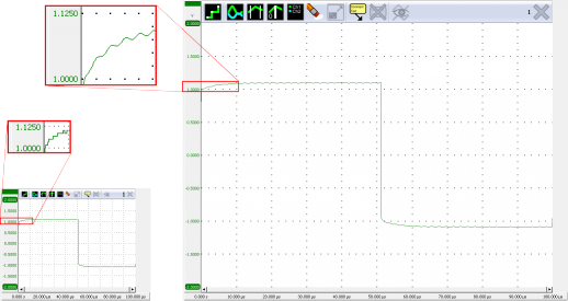 Shown in figure 1 are two displays, both showing a measurement of the same signal. The left display size corresponds to a size comparable to a standalone oscilloscope; at 8 bit resolution, zooming will not reveal more details. The right display corresponds to a maximized window on a standard PC screen; at 14 bit resolution, zooming will still reveal more details.