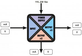 ES170 is a converter module for signal with 2 analog outputs with 3500 V galvanic insulation between input signal and output signals obtained through linear optocouplers. The device allows to convert analog input signal in two analog output signals (each output can be set in voltage or current mode).