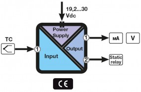 EK109TC is a converter for Thermocouples TCs (J, K, E, N, S, R ,B,T) and provides a mA/V standard output signal. Beside available there is a confi gurable threshold (relay) that may generate an alarm or may be utilized like a thermostat. It’s completely confi gurable through dip switches/trimmer. A 3-way galvanic isolation among Power supply // input // output circuits assures the integrity of your datas.