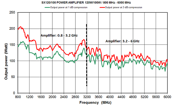 Power at 3 dB compression : 100 W min. up to 3.2 GHz / 75 W min. up to 6 GHz *