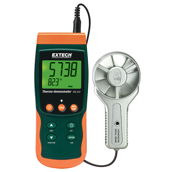 The low-friction ball bearing vane wheel is connected to the meter by a 3.9 ft (1.2 m) long cable. Other features include record and recall of min/max readings, data hold, and auto power off with disable function. Accept external type J and K thermocouple inputs for higher temperature measurements to 2372°F (1300°C).